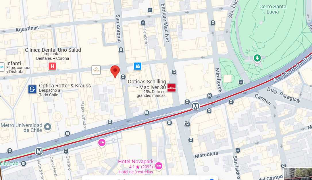 Dirección Moneda 812 oficina 813, piso 8, Santiago Centro, Chile. Working Hours Lun a Vier 10:00am a 19:30pmSábado: 10:00am-15:00pm Telefono 9 4913 6627 +56 9 4913 6627 Redes: Localización en google maps Ver en mapa Formulario de contacto Contáctenos Por favor, activa JavaScript en tu navegador para completar este formulario.Nombre *Telefono o Whats app *Email *Cuéntanos tu requerimientoComo quieres que te contactemosWhats appLlamadoEmailEnviar Map